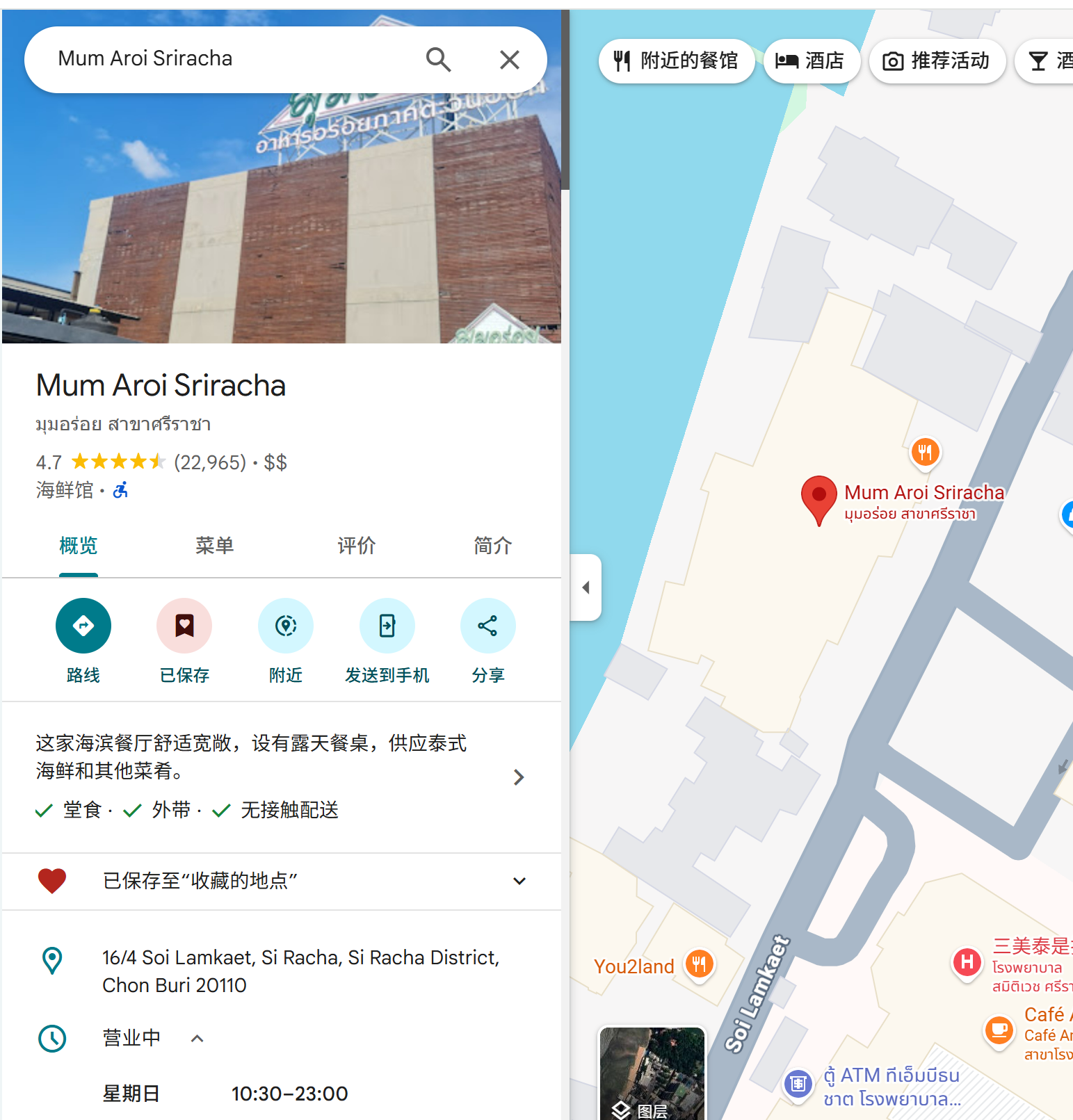 - 完事后,租车去吃饭,一定一定一定要去这家店吃饭 Mum Aroi Sriracha,看看评分的人数和得分就知道了,风景和食物绝对赞