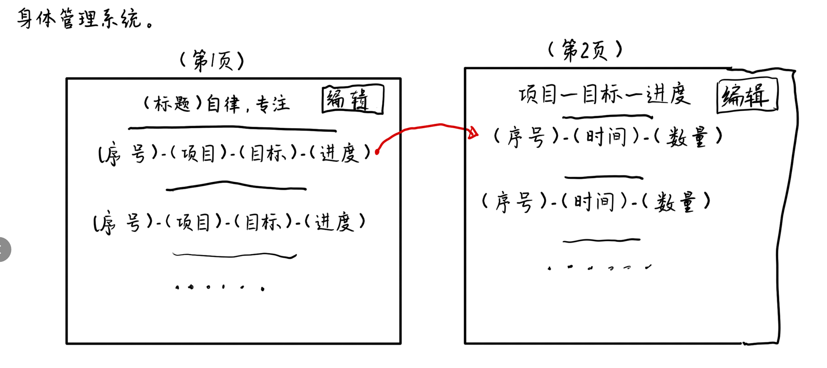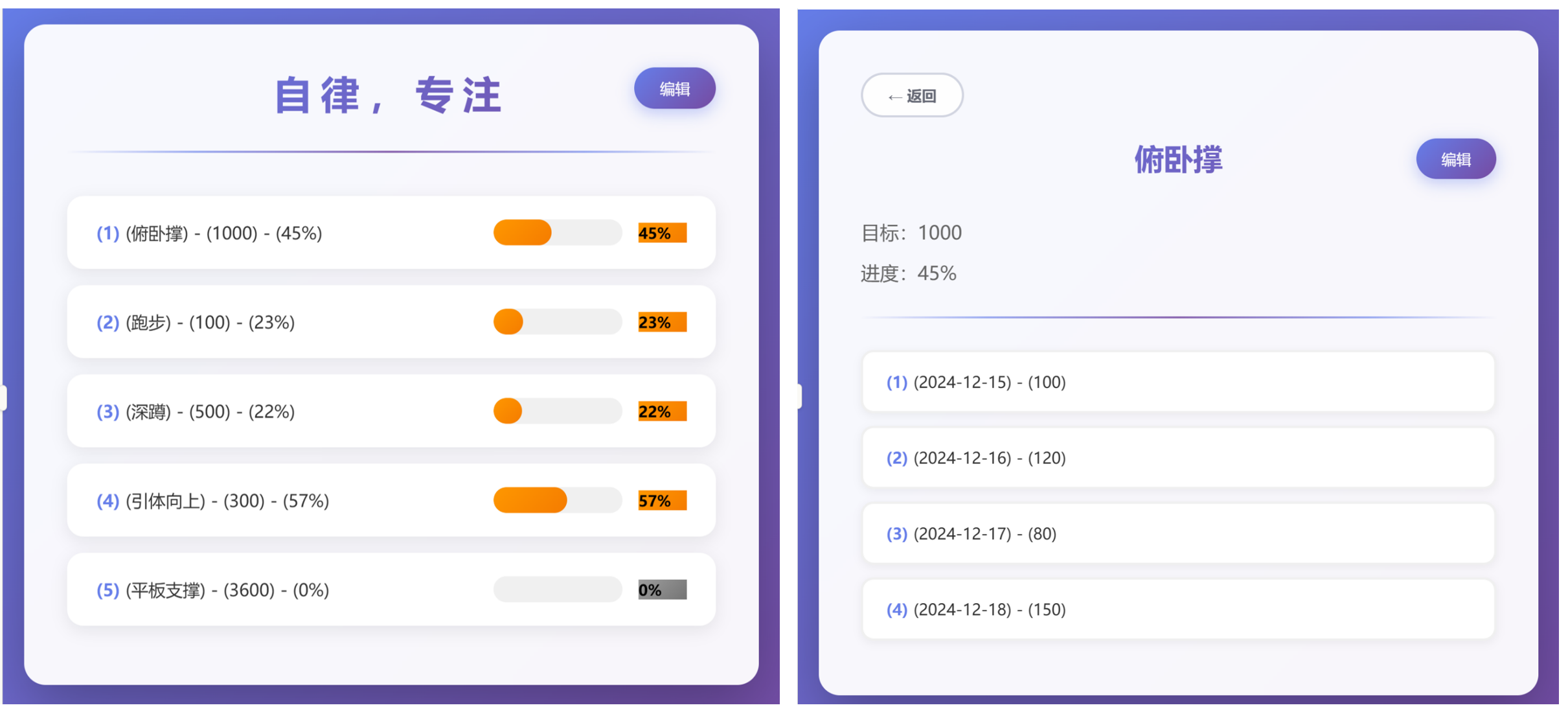 参考图片,我想要创建一个身体管理系统,主要目的是用于健身管理,分为2页,第一页为总览,标题为“自律,专注”,右上角有个编辑按钮,编辑后可新增和删除项目,新增项目后,在下面展示,格式为(序号)-(项目)-(目标)-(进度),图片中的横线为分隔符。每一个项目点击后弹出第二页面,第二页面主要是对项目内容进行展示和编辑,右上角有个编辑按钮,编辑后可新增和删除任务,点击编辑的时候可以填写项目的目标,然后可以新增和删除任务,任务里面可以填入时间和数量,而进度就是所有数量总和除以目标的百分比(0%为默认并且是灰色,100%是绿色,60%以下是橙色,60%~100%是蓝色)。用HTML实现