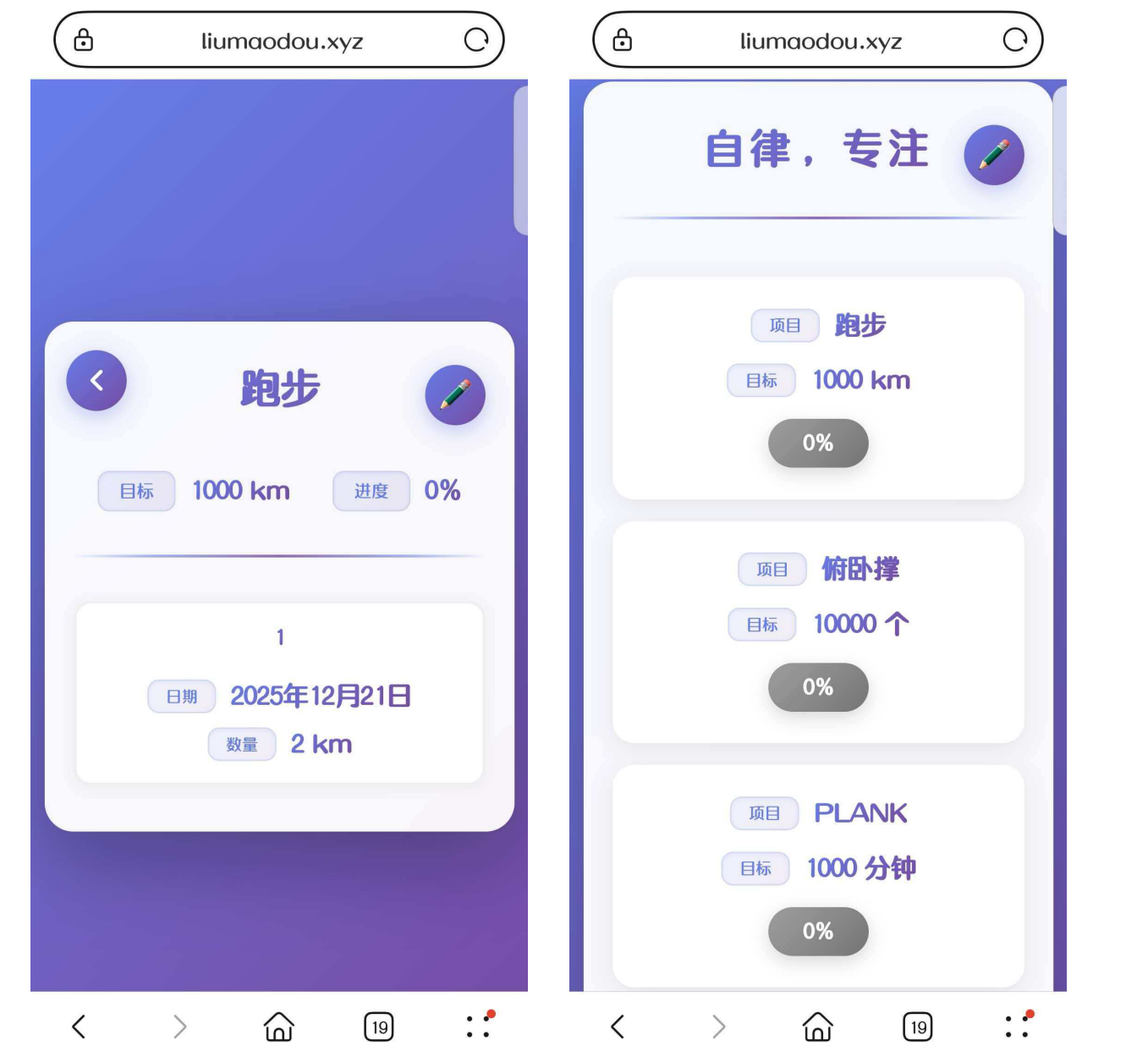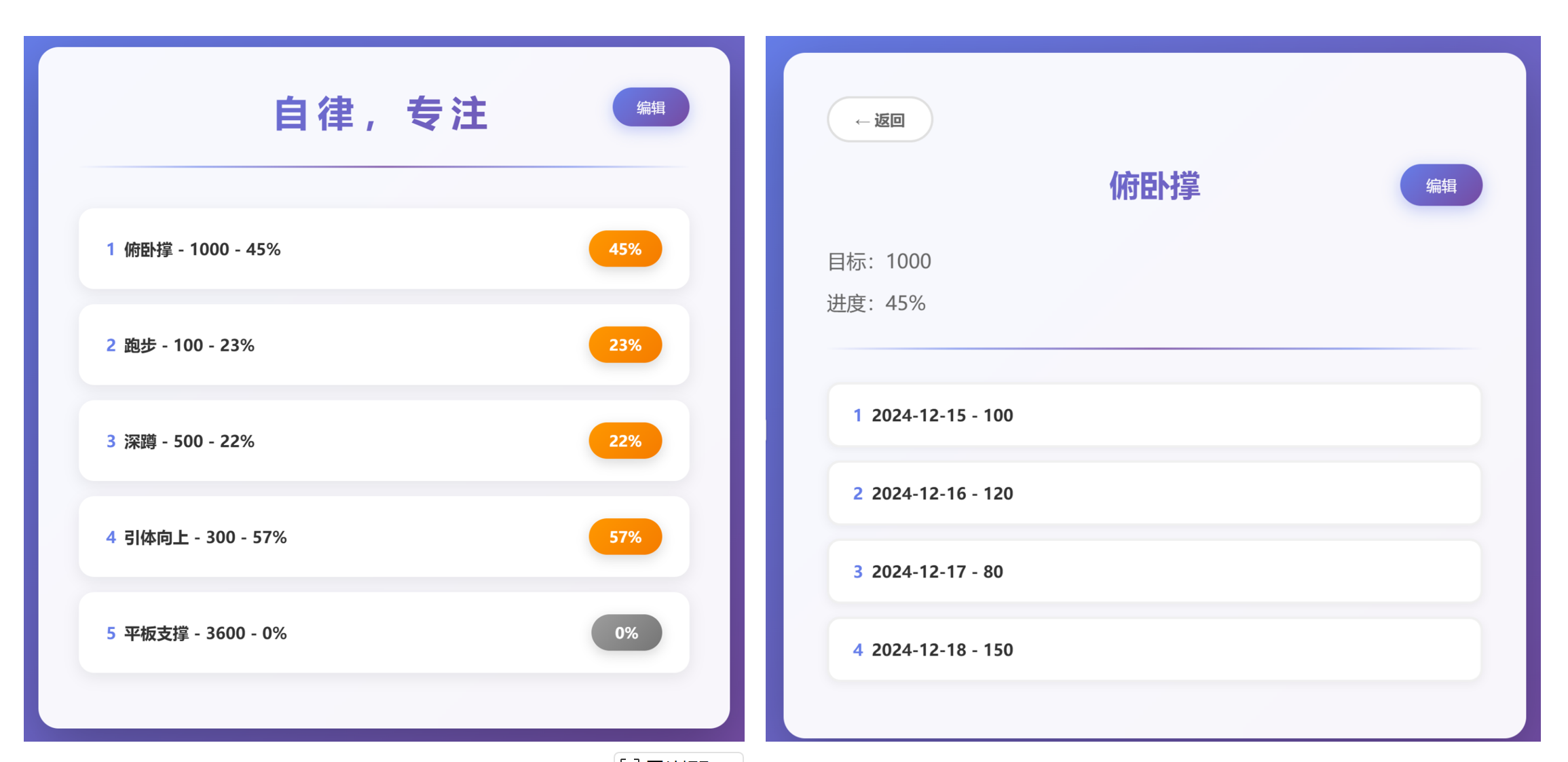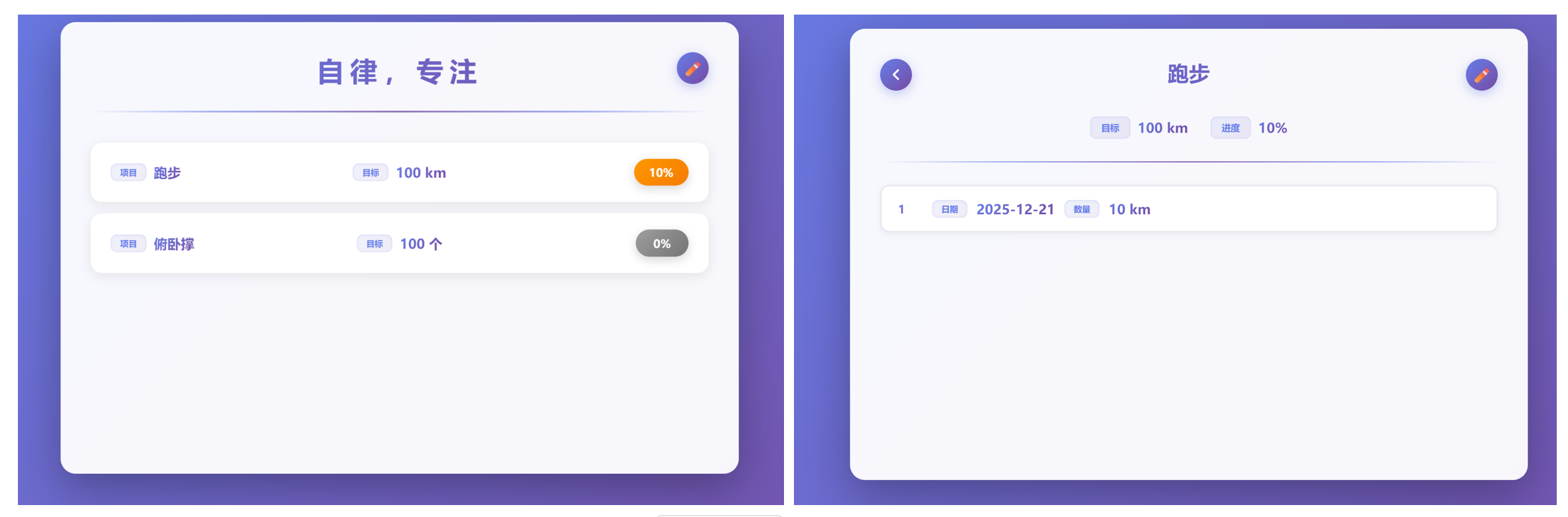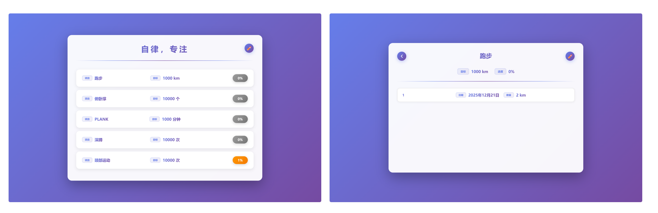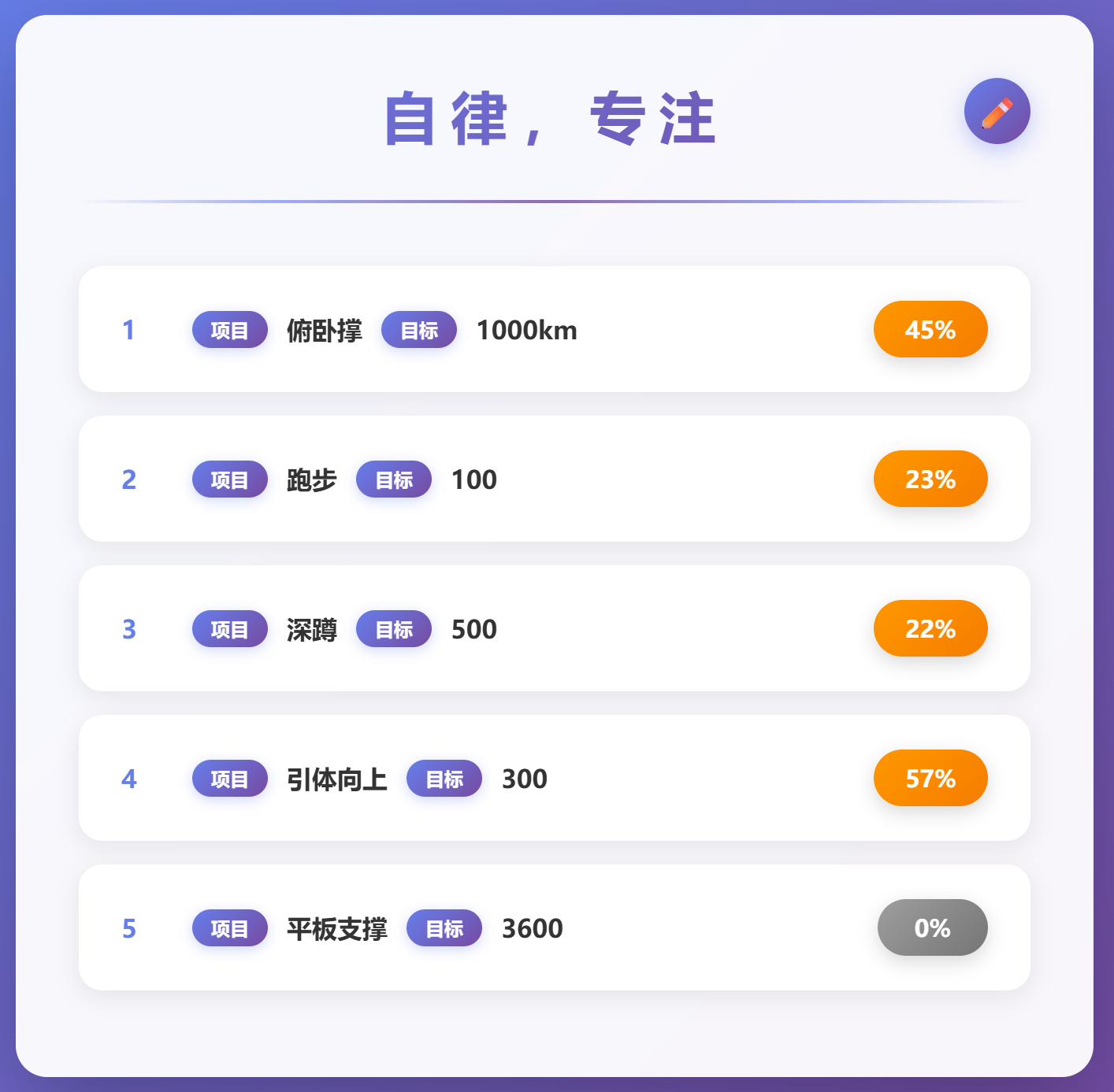 4、项目名字为 俯卧撑 - 1000,感觉不好看,做个优化,项目展示为 序号(保持不变),项目名字(比如这里的俯卧撑)(前面用渐变的按钮写下项目,字体为项目字体80%),中间是目标(带上单位)(前面用渐变的按钮写下目标,字体为目标字体80%),最后为进度(这个保持不变),第二页的目标和进度也放一行展示,参考第一页;第二页任务的时间和数量也参考第一页的方式